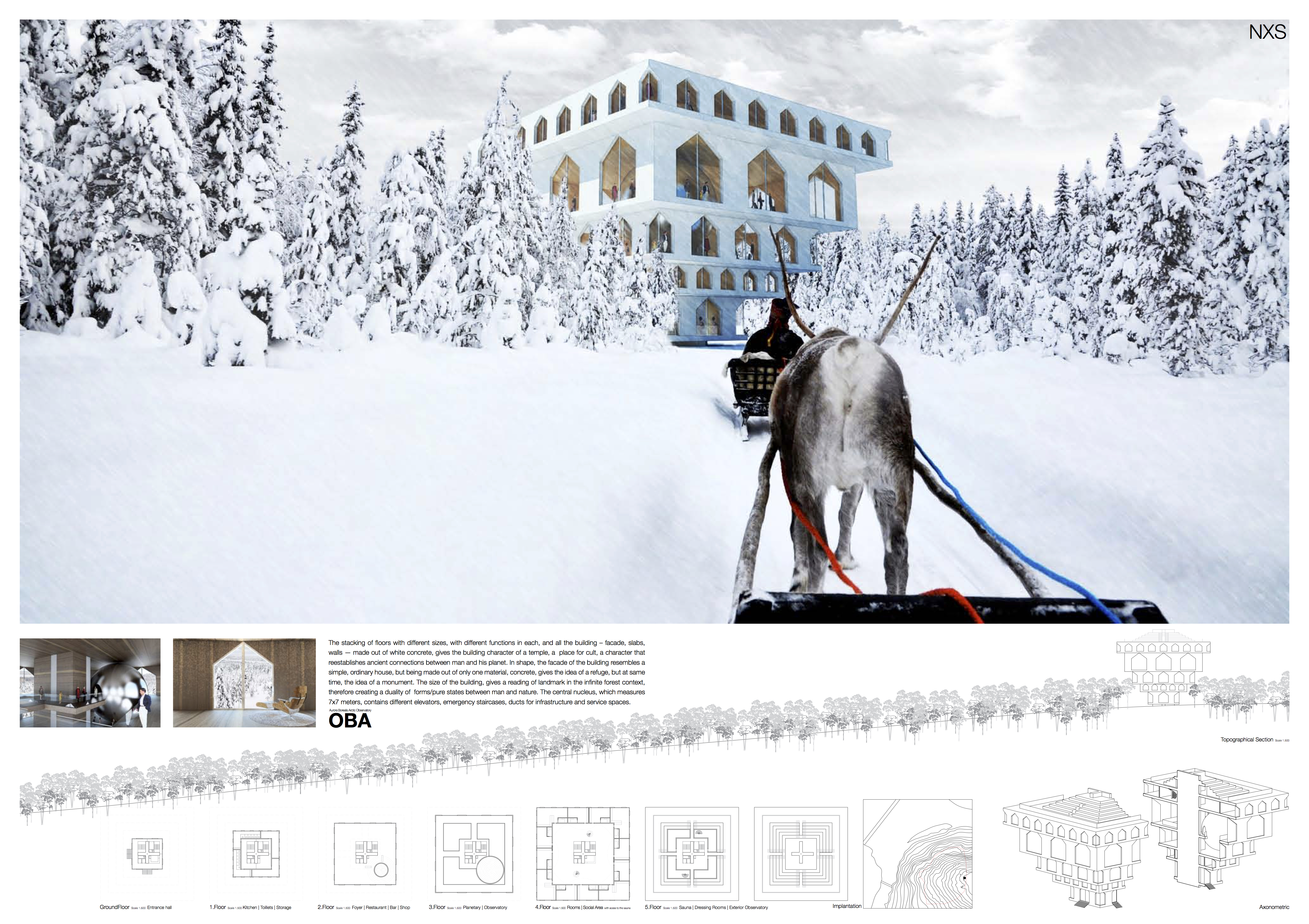 O empilhamento de pisos com diferentes tamanhos, com diferentes funções em cada um, e todo o edifício – fachada, lajes, paredes – feitas de betão branco, dá o carácter construção de um templo, um lugar de culto, que reestabelece ligações antigas entre o homem e seu planeta. A forma, a fachada do edifício assemelha-se a uma casa simples, comum, mas ao ser feito em apenas num material, betão, dá a ideia de um refúgio, mas ao mesmo tempo, a ideia de um monumento. O tamanho do edifício, dá uma leitura de referência no contexto da oresta in nita, portanto, criando uma dualidade de formas/estados puros entre o homem e a natureza. O núcleo central, que mede 7 x 7 metros, contém diferentes elevadores, escadas de emergência, condutas de infra-estrutura e espaços serviços. Projecto de concurso com a co-autoria de dois colegas, Vítor Oliveira e Christian Esteves.